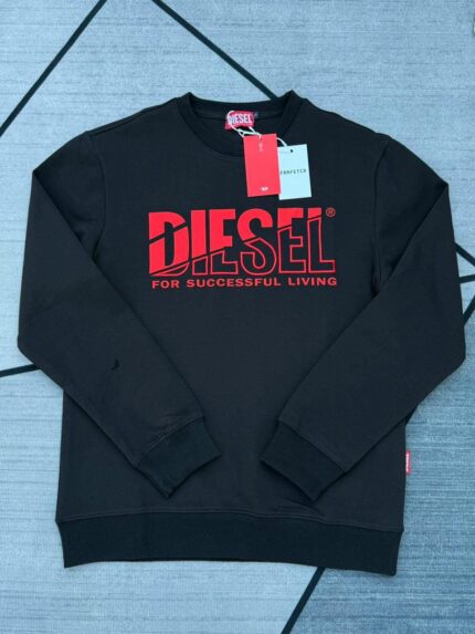 SA Diesel S-Ginn-Div Logo-Print Sweatshirt, available in several colors including off-white/white and black. This regular-fit sweatshirt is made from cotton loopback jersey and features a prominent red "DIESEL" logo with the tagline "FOR SUCCESSFUL LIVING" printed on the chest