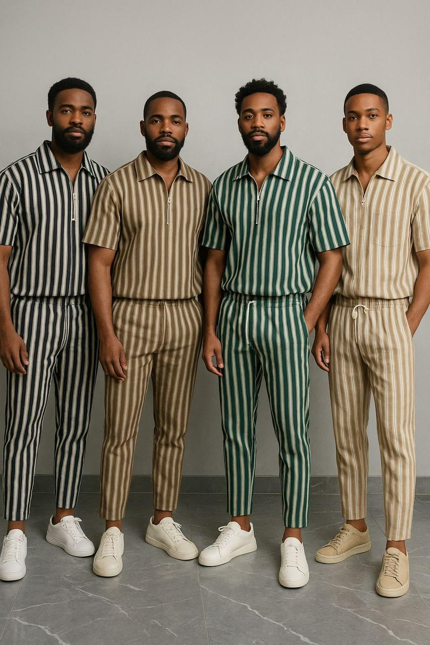 JZS350750 Mens Summer 2 Piece Set Casual Outfits Button Short Sleeve Shirt & Loose Pants Textured Striped Tracksuit Walking Suits